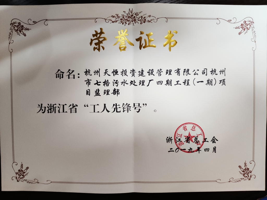 公司七格污水(shuǐ)處理(lǐ)廠(chǎng)四期(一期)監理(lǐ)項目部被授予浙江省“工(gōng)人先鋒号”